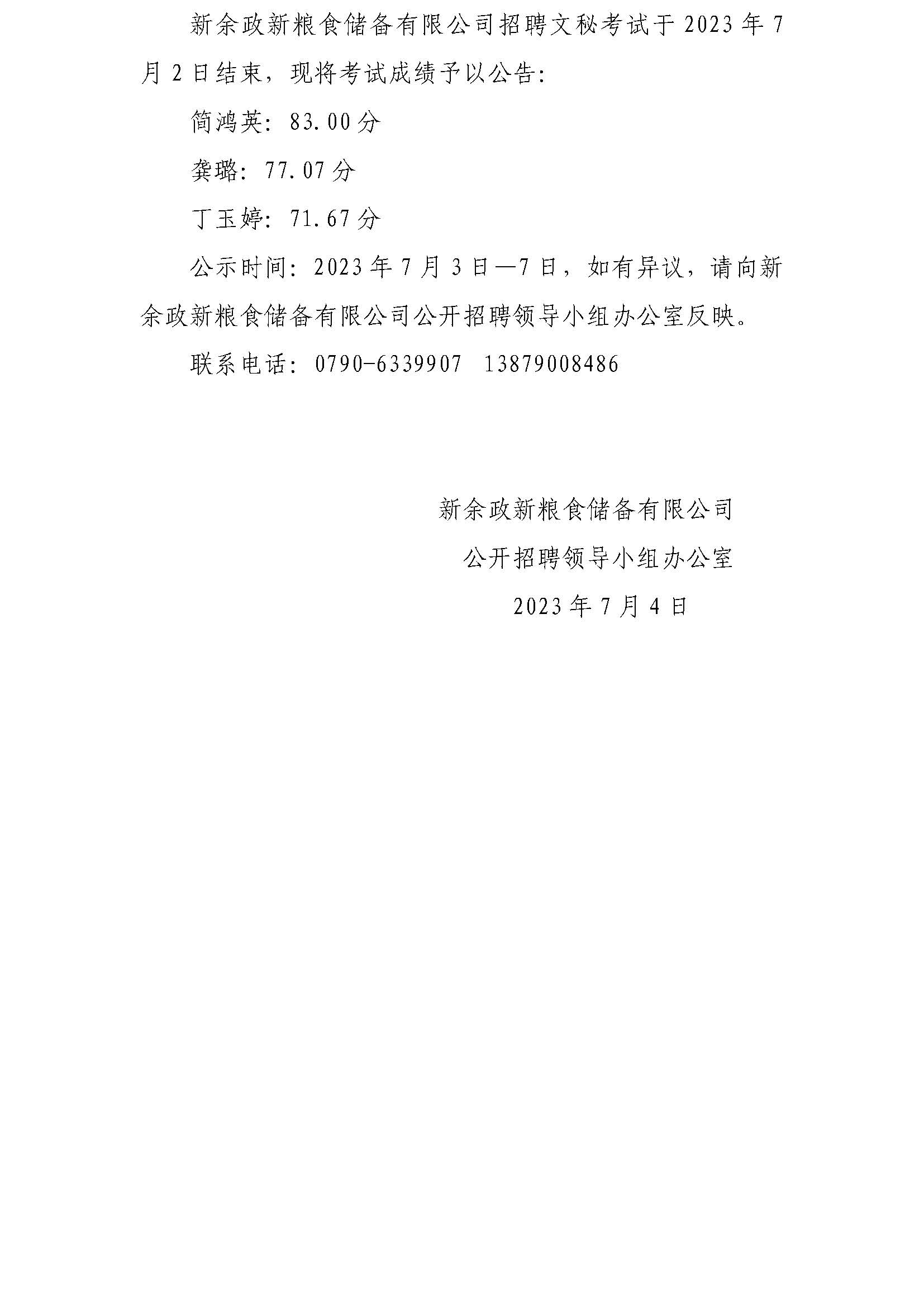 新余政新糧食儲備有限公司招聘文秘考試成績公告