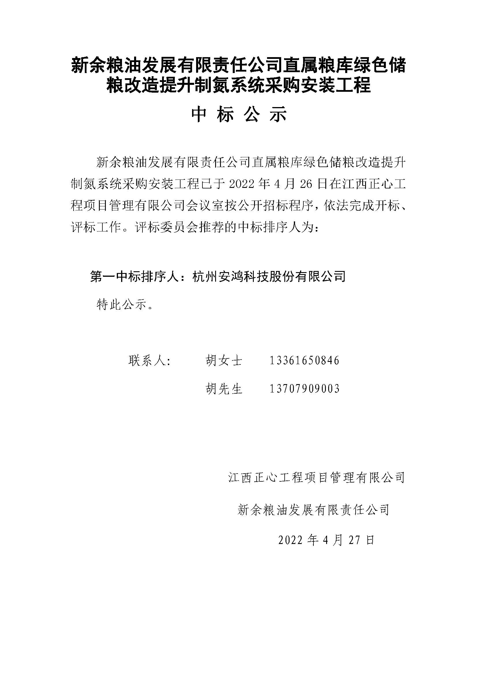 制氮系統采購安裝工程中標公示